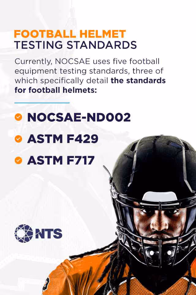 Currently, NOCSAE uses five football equipment testing standards, three of which specifically detail the standards for football helmets: