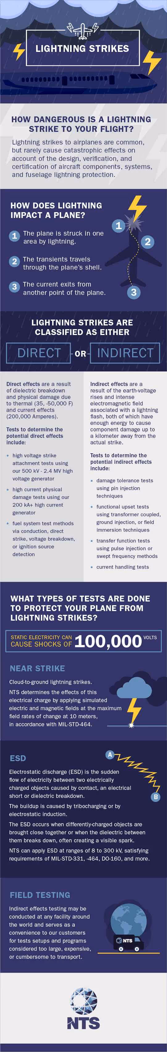 When airborne, lightning will strike either the wing tip or nose. The outer surface of the plane is designed to discharge the energy back into the atmosphere without harming people or equipment on board. When on the ground, planes pose more risk. Refueling, loading luggage and using metal stair cases to deplane passengers are hazards during a lightning storm.*Updated January 10, 2019*