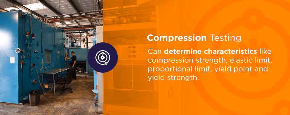 Compression testing can determine characteristics like compression strength, elastic limit, proportional limit, yield point and yield strength. To perform the test, an engineer places the object between two plates. These plates then move in toward each other, compressing the object in the middle. This pressure is applied for what may be a pre-determined length of time, or until the subject of the test is destroyed or irreparably deformed. Eventually, the engineer would move these plates back apart and see whether the object returns to its original shape or remains permanently deformed. A couple of examples of compression tests include: