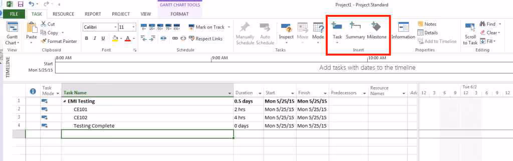 Summary Tasks and Milestone Tasks can also be added from Task tab