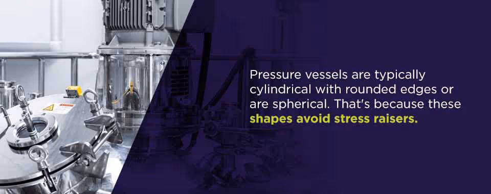 Pressure vessels are designed differently based on their end application, though they all tend to look similar and include the same basic parts. Pressure vessels are typically cylindrical with rounded edges or are spherical. That's because these shapes avoid stress raisers.
