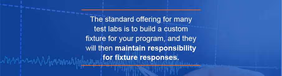 Repeatability/Liability/Fixture Ownership: The standard offering for many test labs is to build a custom fixture for your program, and they will then maintain responsibility for fixture responses. You are paying for the fixture design and build, as well as a guarantee from the test lab this fixture will perform reliably from one test to the next. The major caveat to this service is that the test lab retains ownership of the fixture, because they cannot be responsible for its use and measurements made at other facilities. If you choose to make your own fixture, be sure to review it with the lab during the design phase in order to confirm it will match the test system.